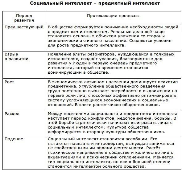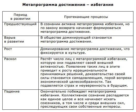 Психологический анализ позволил выявить, что этапы развития сообществ людей чётко коррелируют с психотипом и доминирующими метапрограммами. Всё происходит на фоне действия закона трёх поколений, то есть происходит последовательная смена основного психотипа по цепочке: резонатор – пострезонатор – постпострезонатор – резонатор. При этом резонаторы в своей массе являются предметниками, а другие психотипы – общественниками. Отразим эти процессы в таблице.