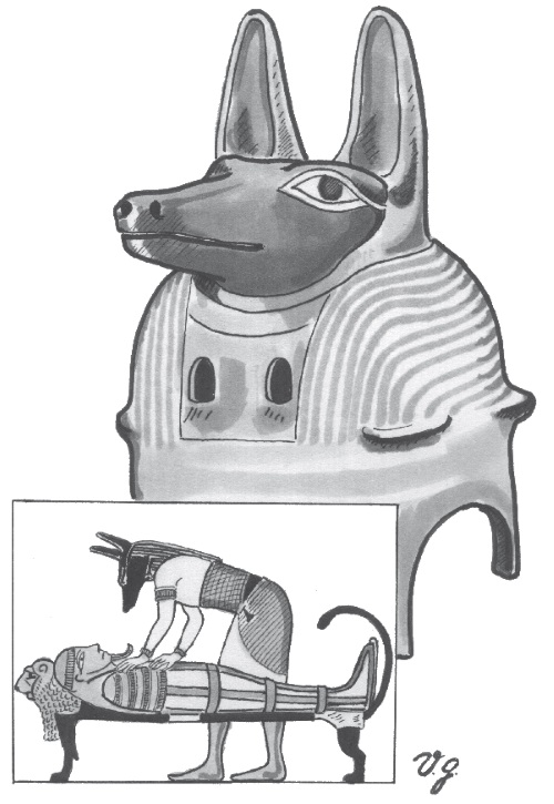 Рис. 2–1. Маска бога смерти в виде головы шакала, которую жрецы надевали на себя в процессе мумифицирования тела (показано в рамке).