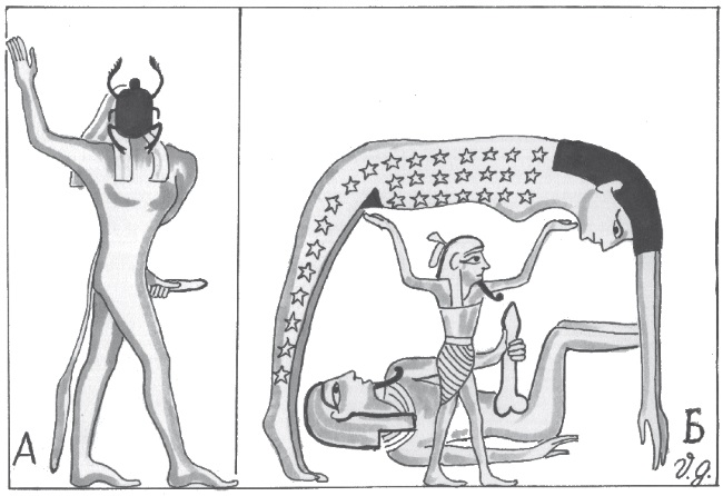 Рис. 2–2. А – Изображение главного бога Амона, Б – египетское представление о происхождении мира – космология (объяснение в тексте).