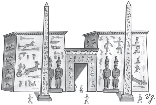 Рис. 2–5. Главный вход в храм Карнак; традиционно вход состоял из двух массивных пилонов и ворот между ними и двух обелисков по сторонам.