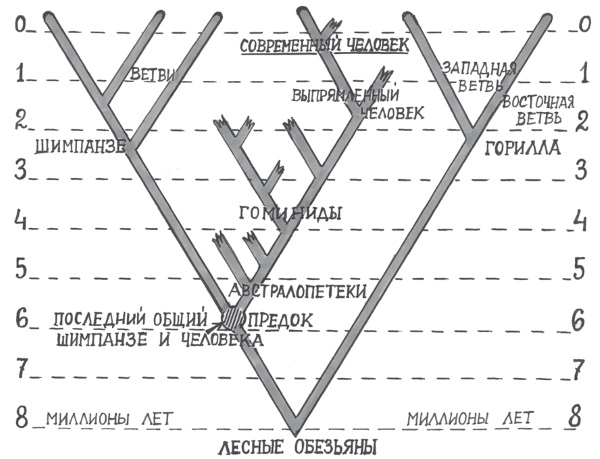 Рис. 4–1. Схема генетического расхождения обезьян и человека в процессе эволюции. Прерванные ветви означают прекращение вида.