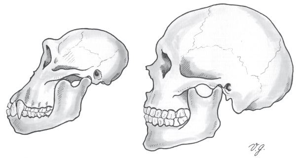 Рис. 4–2. Сравнительные величина и форма черепов: А – шимпанзе, Б – человека.