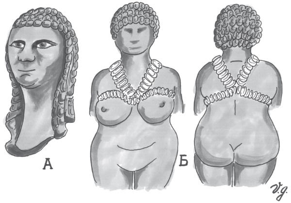 Рис. 7–2. Прическа и украшения первобытных женщин каменного века.