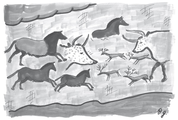 Рис. 8–1. Рисунки животных в пещерах; изображения травоядных в трех разных стилях, очевидно, тремя художниками.