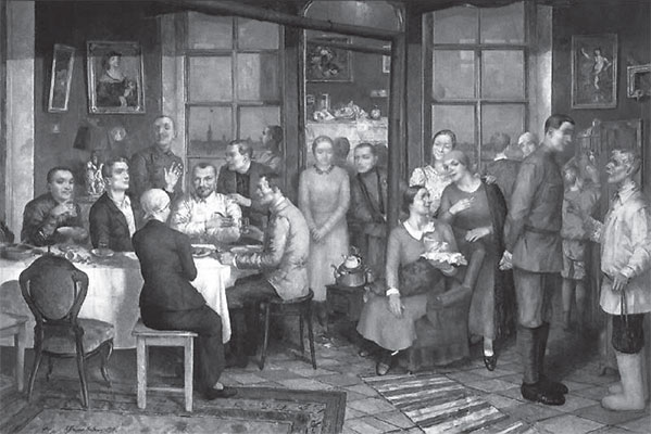 Наконец, третий пример – картина К. Петрова-Водкина «Новоселье» (1936) [илл. 9]. На страницах этой книги мы не раз будем обращаться к данной композиции. Ее сюжет отмечен обилием бытовых подробностей: это визуальный рассказ о вселении советской семьи петроградских рабочих в квартиру «бывших». В отличие от предыдущего примера, здесь план выражения прозрачен: акцент сделан на сюжете, семантике изображения. Последняя определяется двойственностью планов и оппозициями старое/новое, близкое/далекое, жизнь/смерть. Акцентирована дейктическая функция иконических значений: там и тут, тогда и теперь (старинные картины в рамах vs «пролетарская» внешность персонажей, стул vs табуретка, интерьер празднующих новоселье vs пейзаж за окном и т. п.). Иконографический интертекст картины отсылает к жанру vanitas и Тайной вечере (изображение в зеркале натюрморта со знаками vanitas – часы, начатая еда, схема сцены застолья, напоминающей тризну, а также центрально-осевая композиция картины, восходящая к традиции надгробия и очерчивающая фюнеральный код нарратива). Мотив выступает здесь как форма (в смысле мотивных схем В. Проппа), надстроенная над первичной визуальной формой, и благодаря интертекстуальной отсылке эта вторичная форма (мотив-форма) приводит к оплотнению плана выражения: возникает семантический лабиринт. Зритель находится внутри события не в качестве участника (как это демонстрировал предыдущий пример), а в качестве незримого наблюдателя. Указанием на присутствие последнего служит зеркало, расположенное в значимой центральной части композиции, и оно реализует свою традиционную в истории искусства функцию, вводя в представляемую сцену незримого персонажа (Веласкес и Ван Эйк): в данном случае «персонажем» служит отраженный в зеркале натюрморт, которого нет в «реальном» пространстве интерьера и который, как рассказ в рассказе, но уже с противопоставлением двух временных планов, отсылает к быту прежних хозяев. Present Perfect предыдущего примера сменяется здесь на Past Perfect. Имплицитная темпоральность поставангарда вследствие вторичного оплотнения плана выражения выступает как имплицитная вербальность. К этому добавляется игра иконографическими схемами-кодами как знак имплицитной темпоральности. Можно сказать, что мы имеем дело с фрактальной конструкцией: сюжетная и композиционная часть повторяет целое, и благодаря зеркалу цепь замыкается[4].