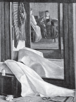 3. В позднем авангарде, в частности, в ряде направлений конца 1920-х годов, осуществивших своеобразный возврат к символизму, встречаем отражение-фикцию объекта рассказа наподобие обманок барокко. Зеркало как некий медиатор реализует одновременно и семантику традиционного натюрморта vanitas, и семантику возможных миров в составе коммунистической утопии. Особенно показательна в этом отношении картина К. Петрова-Водкина «Новоселье» [илл. 9].
