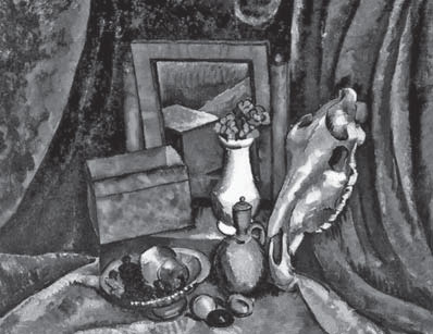 2. В авангарде зеркало как трансфер вещного соприсутствия возникает в форме раздробленного зеркала (раздробленность как знак его вещной природы). Примером может служить весь кубизм, а особенно картина И. Клюна «Автопортрет с пилой» (1914), где аналитически разложенные плоскости выступают как иконическая репрезентация авторефлексии создающего свое изображение мастера (как правило, автопортрет пишется посредством зеркала). Само же представление зеркала появилось еще в преддверии авангарда в 1910-е годы – например, в натюрморте И. Машкова «Зеркало и череп» (1919), где оно маркирует иконографический тип vanitas и тем самым реализует интертекст традиции [илл. 14].