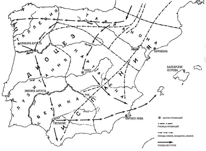 Таким образом, Пиренейский полуостров – это пример весьма успешного исторического эксперимента Рима по романизации завоеванных территорий. У этого процесса была и оборотная сторона. К концу эпохи античности Испания была настолько романизована, укоренена в римское государство, его экономику, общество и культуру, что разделила судьба центра – агонию античной цивилизации, ее трансформацию в иную систему ценностей и их иное материальное воплощение.