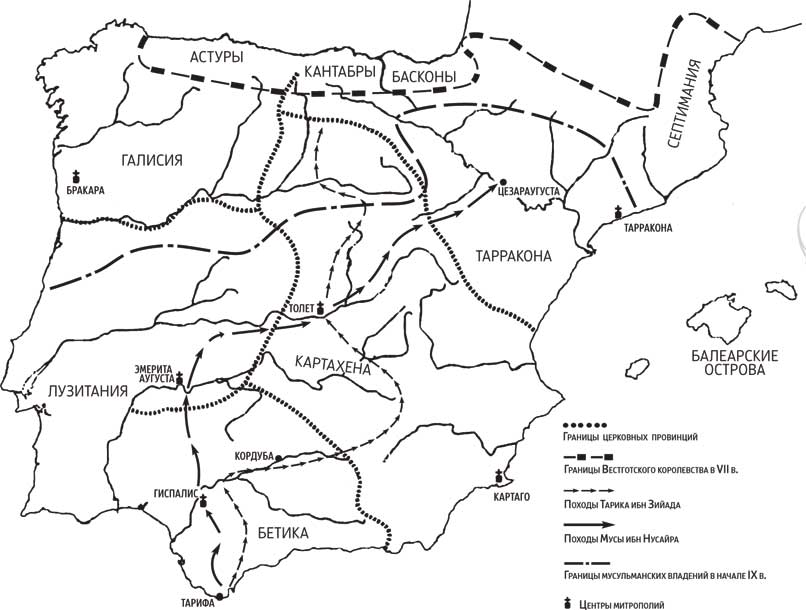 Арабы, в VII в. вышедшие за пределы Аравийского полуострова и начавшие масштабные завоевания на Ближнем Востоке, к началу VIII в. создали обширное государство с центром в Дамаске. В своих походах они доходили до Константинополя, одерживали победы в Северной Индии и на Кавказе, в Малой Азии и Северной Африке. Дамаскскому Халифату подчинялись покоренные территории, которые были превращены в провинции и управлялись наместниками или, по-арабски, эмирами. Эмират, существовавший в Северной Африке, на протяжении первого столетия хиджры (которое отсчитывают от 622 г. н. э.) неуклонно рос, впитывая все новые и новые, более западные территории. Отсюда уже хорошо были видны богатые земли сопредельного обширного полуострова.