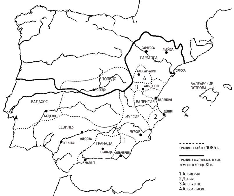 В первой трети XI в. возвращение к власти правителя омейядского происхождения – единственное, что позволило бы восстановить общность Аль-Андалуса – было уже невозможно. Звезда ислама, свет которой доходил до дворов Памплоны, Бургоса и Леона, клонилась к закату. С 1055 г. мусульманские тайфы вынуждены были противостоять энергичному и сильному противнику в лице Кастилии. Король Фернандо I сражался с эмирами Сарагосы, Толедо и Бадахоса, брал крепости и налагал на эмиров дань. В 1064 г. в руки христиан перешли Коимбра и Барбастро. В 1085 г. Альфонсо VI, который и до этого оказывал сильное давление на аль-Кадира, мирно занял Толедо, а затем распространил свою власть на всю эту провинцию бывшего Аль-Андалуса.