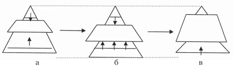 14. Если пирамида теряет свою правильность, то социальное давление уже не подчиняется выражению (1). Если, к примеру, какой-либо срединный слой испытывает давление меньшее, чем у выше расположенного, то появляется естественное стремление заполнить этот слабо напряженный слой, перейти в него из других слоев (см. рис. 2а). Пирамида разбухает (см. рис. 2б), и если этот процесс не остановить, можно получить неестественно раздувшуюся пирамиду (см. рис. 2в), в которой будут доминировать «срединные» интересы, что приведет к понижению темпов развития общества.