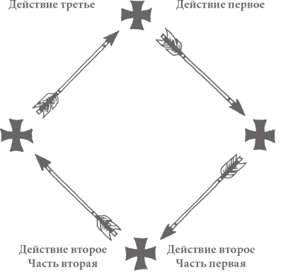 Общаясь с коллегами в Риме, я сделал еще один шаг в развитии этой идеи: теперь графическое отображение путешествия героя стало видеться мне не как окружность, а как ромб. Это произошло, когда я объяснял, что каждое действие ставит перед персонажем определенную задачу, предписывая ему определенное направление движения, а кульминации выполняют функцию поворотных моментов, заставляя героя ступить на новую тропу и устремиться к новой цели. В первом акте он, к примеру, ищет клад, но, встретив свою потенциальную любовь в момент преодоления первого порога, меняет цель и начинает добиваться расположения прекрасной девы. Наступает момент испытания: злодей похищает влюбленных. Теперь их цель – вырваться на свободу. И если злодей убивает одного из беглецов, спешащих домой, то выживший клянется отомстить – и это его новая цель. Изначальная цель тоже может быть достигнута, или возможна некая сверхзадача (обрести уверенность в себе или смириться с прошлыми неудачами), которая сохраняется при всех поворотных моментах, когда герой меняет свои внешние цели.