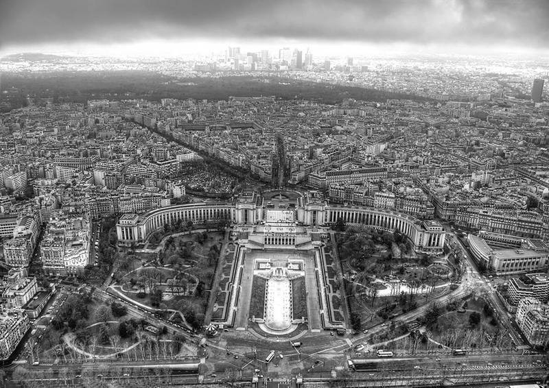 Вид на площадь Трокадеро с Эйфелевой башни. Название площадь получила от Холма Трокадеро, на котором расположена, а он, в свою очередь удостоился им в честь победы французов в 1823 году при осаде форта Трокадеро, принадлежащего испанцам
