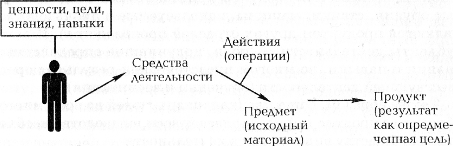Любая деятельность может быть представлена как состоящая из элементарных актов, которые начинаются с выбора предмета (исходного материала) для преобразования и завершаются определенным результатом (продуктом деятельности). По своему содержанию эти элементарные акты различны, поскольку в них преобразуются качественно специфические предметы. Но структура у всех них общая, одна и та же. Характеристику этой структуры можно найти в главном труде К. Маркса «Капитале» (т. 1, гл. 5). Маркс ее описал, анализируя человеческий труд в системе материального производства. Но этот анализ можно распространить на любую деятельность. Тогда можно изобразить элементарный акт любой деятельности в виде следующей схемы, которая была предложена известным отечественным философом второй половины XX в. Г. П. Щедровицким. Я воспроизведу ее с небольшими модификациями.
