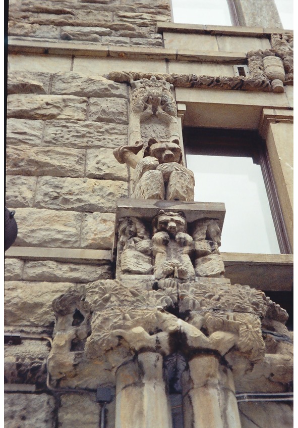 Медвежьи головы между проемами окон… Фигурки сидящих медведей, которые держат в лапах молоты… Замковые камни в виде маски совы, водяного Ветехинена… Маски лесных духов Тапио и Лембо, с выпученными глазами и широко раскрытыми ртами… А на рельефной вставке – карлики-Пейкко, с ухмыляющимися физиономиями, огромными руками вцепились в тяжелый каменный блок. В самом деле, не присутствует ли во всем этом некий элемент карикатурности или иронии? Уродливое и комичное превращается в эстетическое! Перед нашими глазами «оживает» старинная карельская легенда и медведь, неожиданно, предстает в человекоподобном обличии.