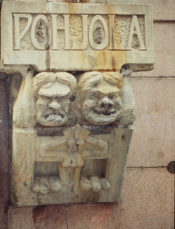 На другом фасадном рельефе, под надписью «Pohjola», изображена ревностная хранительница Севера – колдунья Лоухи. Х-М. Флодин представила ее в образе древней, почти беззубой старухи. …А кто рядом с ней? Наверное, это кузнец Ильмаринен. Один из самых ярких и загадочных персонажей карело-финского эпоса. Невольно задаешься вопросом, почему Ильмаринен, который изготовил по заказу старухи Лоухи чудо-мельницу Сампо, так и не осчастливил своих соплеменников, жителей легендарной страны Калевы?