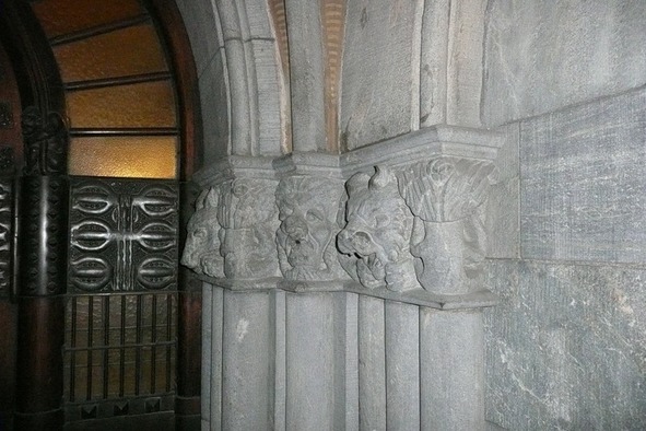 …Теперь, пожалуй, откроем дверь и пройдем внутрь здания. У главного входа нас, буквально, обескураживают рельефные изображения во фризах. Тут и Лембо с медведями, и какие-то неизвестные духи природы в образах диких зверей,.. Все это возникает перед глазами посетителя совершенно неожиданно, словно неоткуда. Мы невольно ощущаем испуг, а спустя какое-то мгновение улыбаемся и продолжаем с интересом рассматривать гротескную монументально-декоративную скульптуру. Вестибюль перекрыт «готическим» сводом, создающим иллюзию присутствия в средневековой постройке. Это ощущение усиливает и тяжелая дверь с кованой ручкой, оформленная фигурным литьем и резьбой с орнаментом в национальном «вкусе». Забегая вперед, отметим, что в здании страхового общества «Похъюола» от эпохи модерна сохранилось и еще одно помещение с достаточно оригинальным интерьером. Это так называемая парадная гостиная или зал приемов. Стены данного помещения с особым изяществом отделаны натуральным деревом. Расходящиеся раструбом стержни колонн, которые находятся в центре зала, декорированы металлическими скобами со стилизованным цветочным орнаментом и гротескными резными фигурками, также изображающими лесных духов. С. Грипенберг в своем очерке подчеркнул: