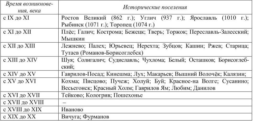 Изучение культурно-исторического потенциала Верхневолжья показывает его значительное многообразие и достаточно высокую плотность объектов туристского интереса. Согласно Федеральной целевой программе «Сохранение и развитие архитектуры исторических поселений (2002–2010 гг.), на исследуемой нами территории выделено 53 исторических поселения, в том числе в статусе городов 44. Как записано в правительственном Постановлении, «исторические поселения являются городскими и сельским поселениями, в границах которых расположены объекты культурного наследия: памятники, ансамбли, достопримечательные места, а также другие культурные ценности, созданные в прошлом, представляющие собой археологическую, историческую, архитектурную, градостроительную, эстетическую, научную или социально-культурную ценность, имеющие важное значение для сохранения самобытности народов Российской Федерации, их вклада в мировую цивилизацию». Представленный в виде таблицы перечень исторических поселений по времени их возникновения позволяет увидеть их значимость в истории Российского государства.