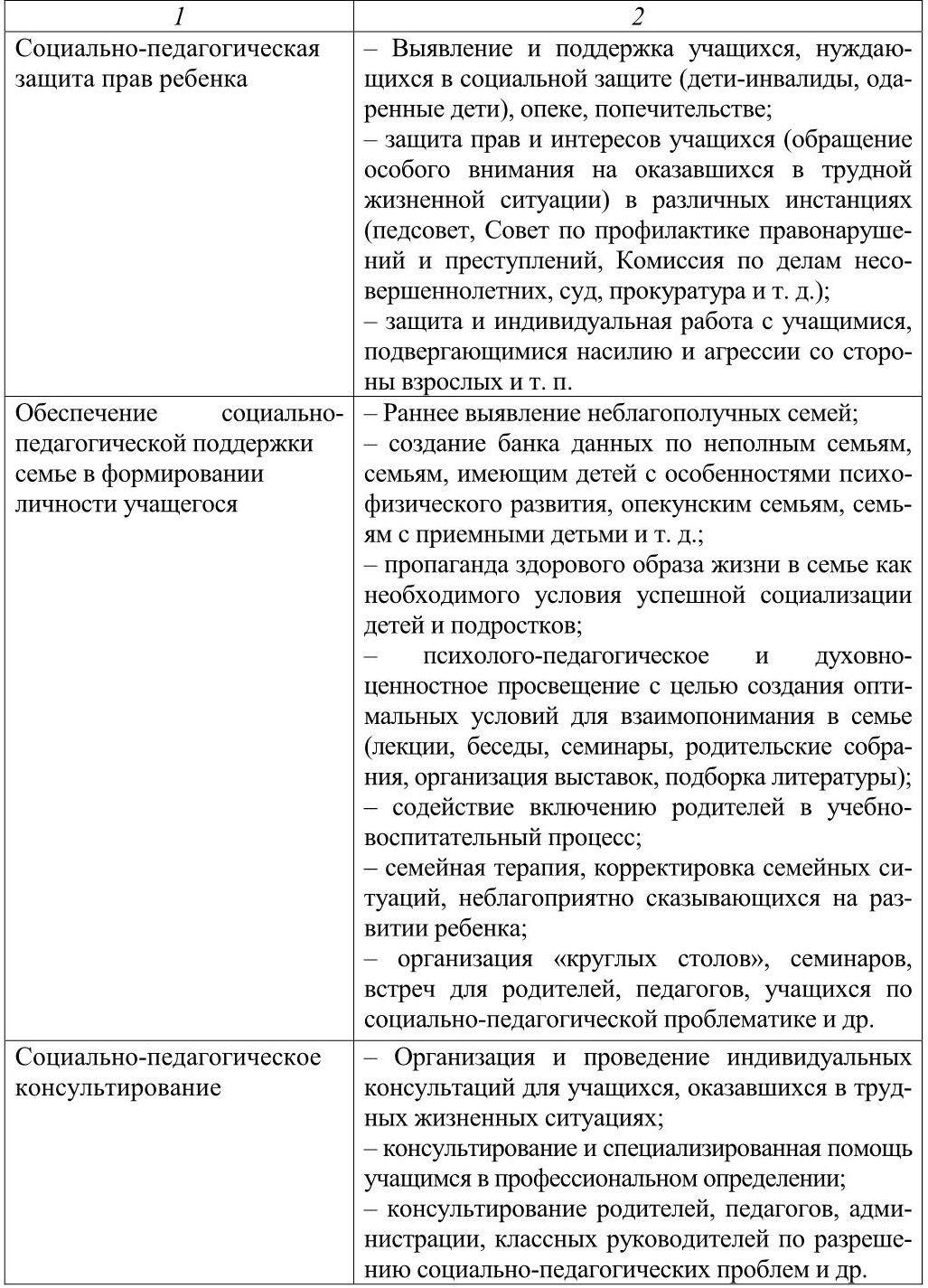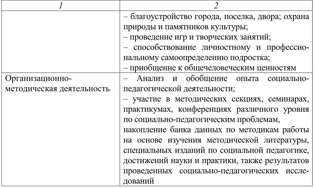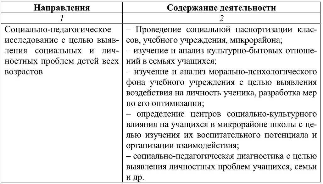 По согласованию с администрацией, ввиду имеющихся проблем в рамках конкретной школы, социальный педагог может развивать свою деятельность в необходимых направлениях, наполняя их конкретным содержанием. Предлагаемая ниже таблица 1 отражает примерный перечень и содержание основных направлений деятельности социального педагога.