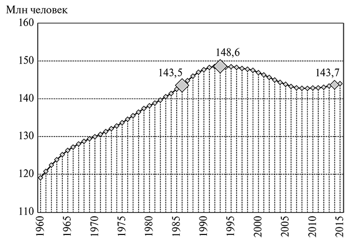 Естественная убыль населения России обусловлена тем режимом воспроизводства населения с низкими уровнями смертности и рождаемости, который сложился в России уже к 1960-м гг. В течение еще некоторого времени естественный прирост оставался относительно высоким из-за особенностей возрастной структуры населения, в которой был «накоплен» определенный потенциал демографического роста. Но по мере исчерпания этого потенциала естественный прирост начал снижаться. Тем не менее вплоть до 1990-х гг. именно он в основном и обеспечивал рост населения России.