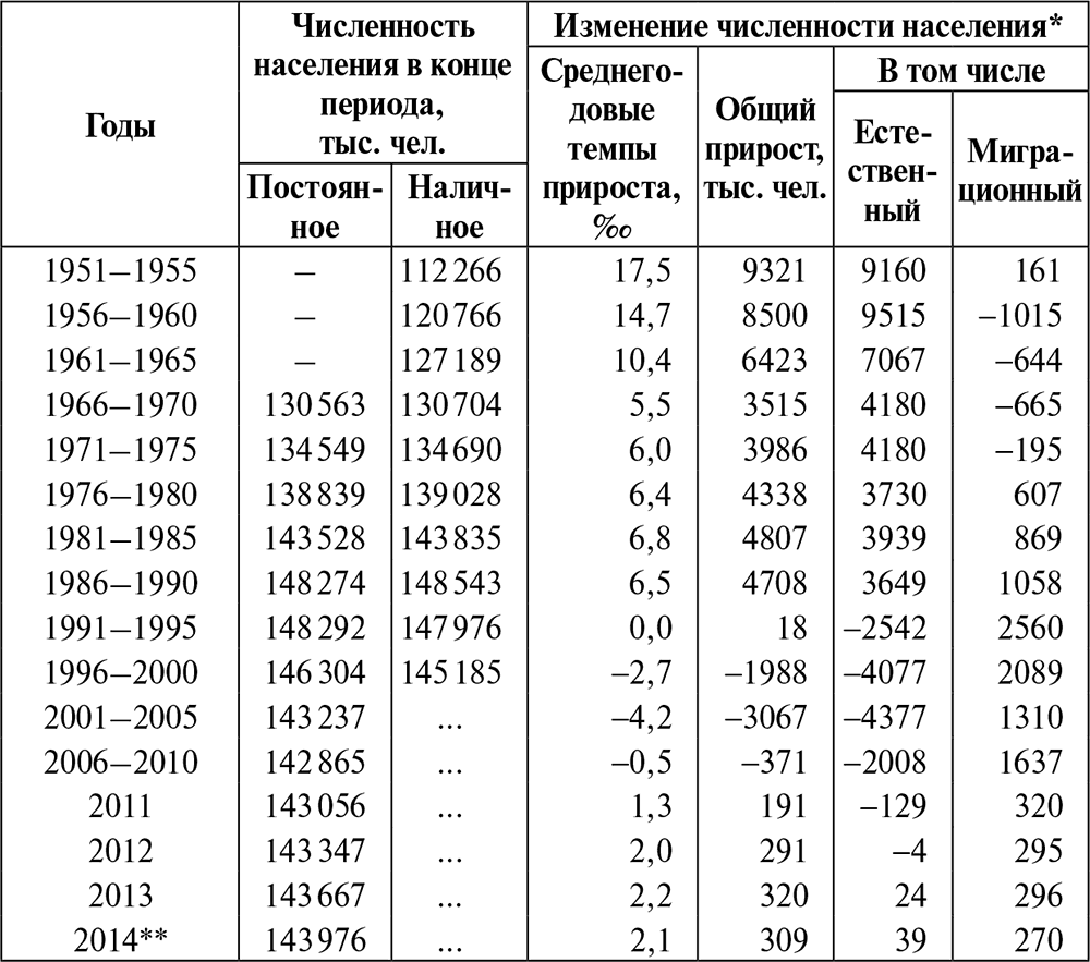 * Постоянное население, к которому относят лиц, постоянно проживающих на данной территории, включая временно отсутствовавших на момент переписи, представлено на дату переписей 1979 и 1989 гг. и на начало других лет в соответствии с данными текущего учета. На начало 2015 г. (или за 2014 г. на рис. 1.2–1.4) представлена предварительная оценка по данным помесячного оперативного учета за январь – декабрь