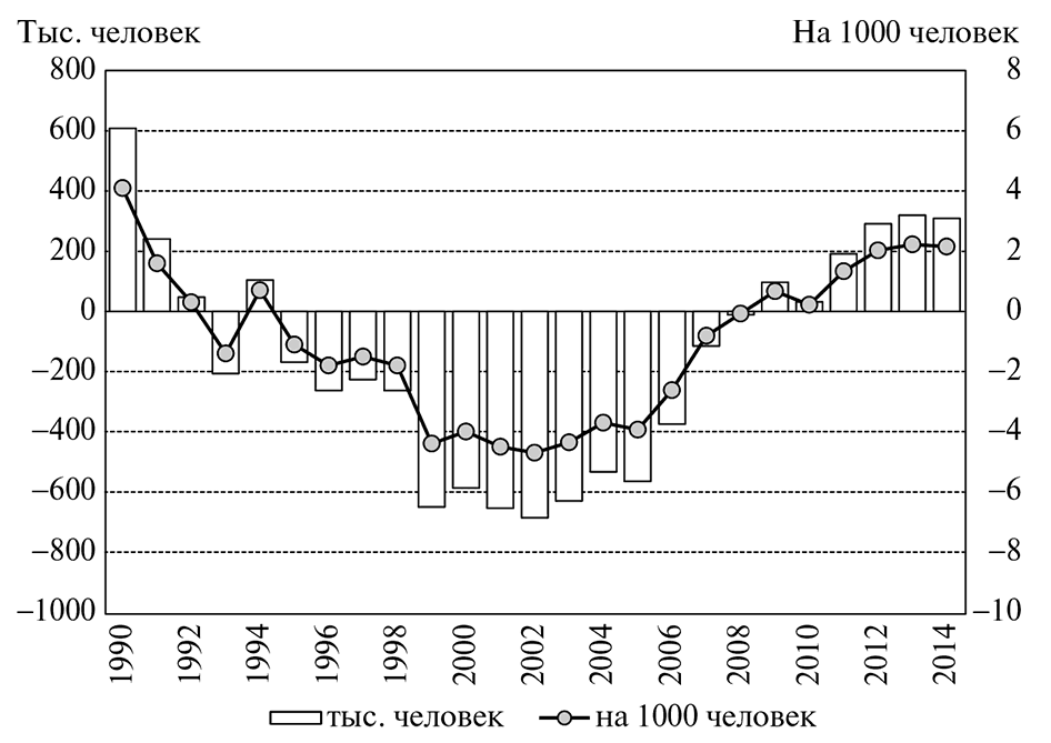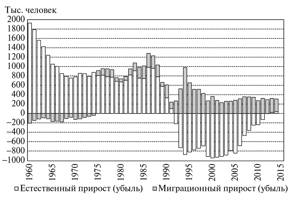 Естественный прирост населения России оставался высоким – более 1 % в год – до середины 1960-х гг. (исключая годы войн и голода 1932–1933 гг.). Затем он стабилизировался на уровне 0,5–0,7 %. В течение примерно 30 лет естественный прирост сочетался с миграционной убылью населения (за счет превышения числа выбывавших из России в другие союзные республики СССР над числом въезжавших в нее оттуда), что не мешало довольно быстрому росту населения. С середины 1970-х гг. население увеличивалось за счет как естественного, так и миграционного прироста, который, как правило, не превышал четверти общего прироста. Начиная с 1992 г. в условиях естественной убыли населения миграция стала единственным источником роста его численности, однако чаще всего недостаточным для того, чтобы компенсировать естественную убыль.