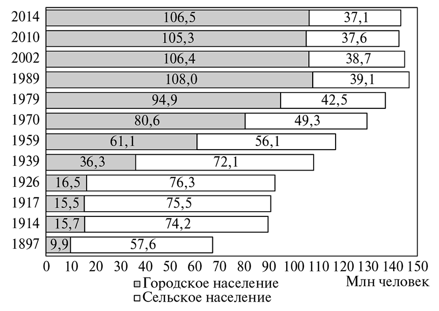 В итоге доля горожан в общей численности населения России остается практически неизменной уже более четверти века. Стагнация последовала после периода быстрого и устойчивого роста – с менее чем 15 % в конце XIX в. до 1/3 в конце 1930-х гг., более 1/2 в конце 1950-х гг. и почти 3/4 в конце 1980-х гг. По данным переписи 1989 г. доля городского населения составляла 73,4 %, 2002 г. – 73,3 %, 2010 г. – 73,7 %. К началу 2014 г. она поднялась до 74,2 %.