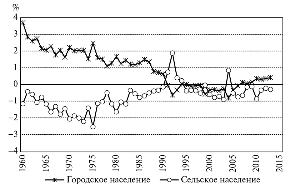 Для сельского населения по-прежнему характерна убыль, хотя в отдельные годы она приближалась к нулевой отметке и даже сменялась ростом в 1991–1994 и 2004 гг. Выраженные зигзаги в темпах прироста численности городского и сельского населения были обусловлены изменениями в факторах ростах. После переписи 2010 г. интенсивность убыли сельского населения была относительно небольшой: -3,5‰ в 2011 г., -2,3‰ в 2012-м и -3,0 % в 2013 г.