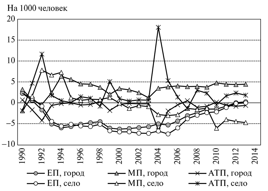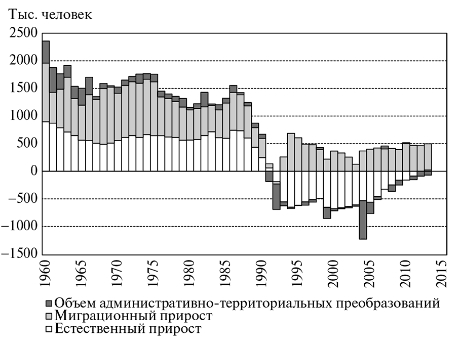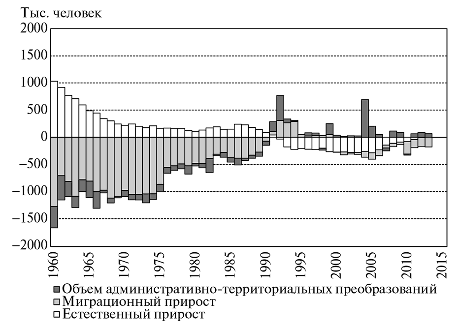 Новым явлением стал миграционный прирост сельского населения, сохранявшийся на протяжении 1990-х гг., хотя существенным его значение было лишь в 1992–1994 гг., а также прирост за счет административно-территориальных преобразований, который в 2004 г. достиг 693,9 тыс. человек, а в целом за 2000–2013 гг. составил 1402,7 тыс. человек.
