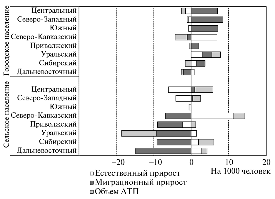 Естественный прирост, хотя и меньшей интенсивности, наблюдался также у сельского населения Уральского, Сибирского и Дальневосточного федеральных округов. Кроме того, сельское население Сибирского и Дальневосточного федеральных округов увеличивалось за счет административно-территориальных изменений, однако миграционный отток превосходил по своей величине совокупный эффект обоих факторов роста. Миграционный отток в сочетании с естественной убылью наблюдался у сельского населения Приволжского федерального округа. Миграционный прирост сельского населения наблюдался только у сельского населения Центрального федерального округа (1,0‰)[24] и в Северо-Западном федеральном округе (0,4‰)[25], однако он не компенсировал потери из-за естественной убыли.