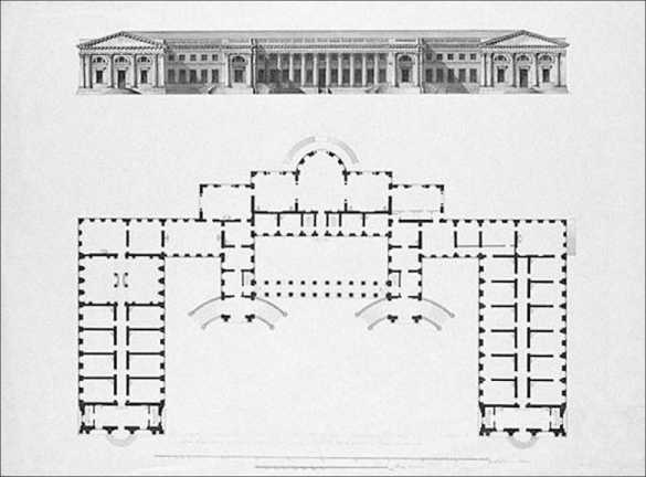 Строительство дворца стартовало в конце строительного сезона 1792 г., в августе, когда рескриптом, данным в Царском Селе, Екатерина II предписывала спешно произвести торги и начать работы еще до наступления зимы. Торги выиграл некий прапорщик Новиков, оценивший строительство дворца в 286 000 руб. Отметим, что по первоначальной смете, составленной архитектором Нееловым, стоимость постройки дворца определялась в 221 431 руб. 45 коп. К этой сумме добавлялись средства на постройку Кухонного корпуса и служб – 73 566 руб. 48 коп.[10] В 1793 г. императрица лично определила место, на котором был выстроен Кухонный корпус. По смете и плану Дж. Кваренги общая сумма затрат на строительство увеличилась до 351 166 руб. 69 коп.