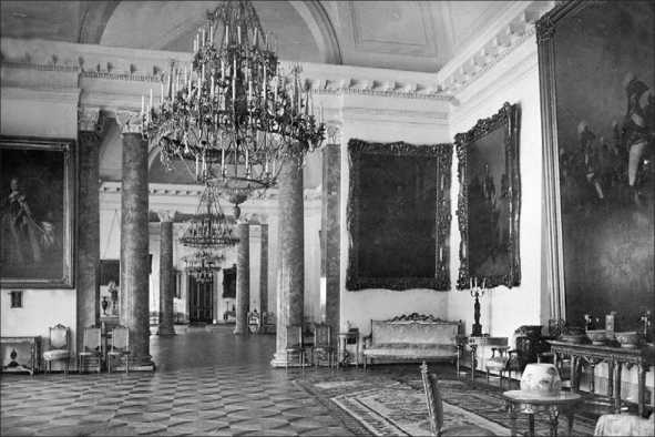 Например, в Концертном зале находилось: «Образ в окладе серебряном; 8 столов простого дерева позолоченных с досками белого мрамора; 36 стулов простого дерева крашеных под лаком с подушками алыми сафьянными; ящик красного дерева для дров; 3 паникадила больших хрустальных в бронзовой оправе; 4 дивана, на них матрацы в наволочках штофных белых с такими же покрывалами; на камине 2 монумента римских императоров литых из гипса».[30]