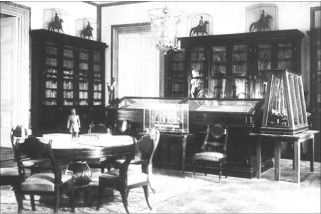 В декабре 1816 г. по высочайшему повелению Александра I его юношескую библиотеку, составленную Екатериной II и хранившуюся в Александровском дворце, передали по описи в Императорский Царскосельский лицей, «с тем, однако ж, чтобы оная сохранена была и служила для употребления только, а не поступала в собственность Лицея». Библиотека передавалась в Лицей вместе со шкафами красного дерева.[73] Судя по реестру, составленному в январе 1818 г., книги (всего 165 экземпляров) были распределены по разделам: история, экономика, наука и искусство, философия и эстампы. Все книги были на французском языке.