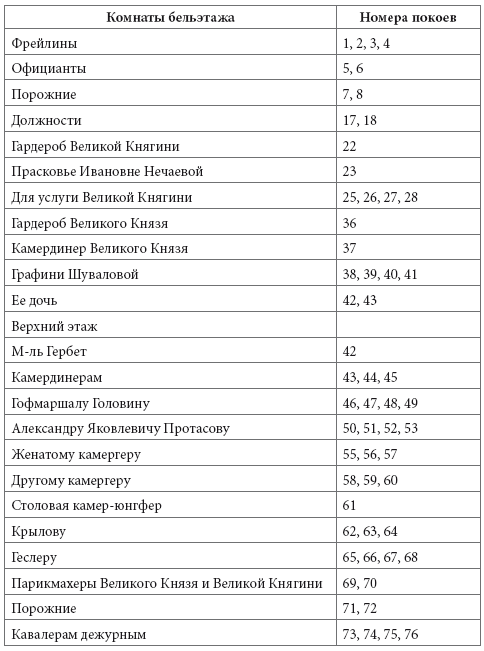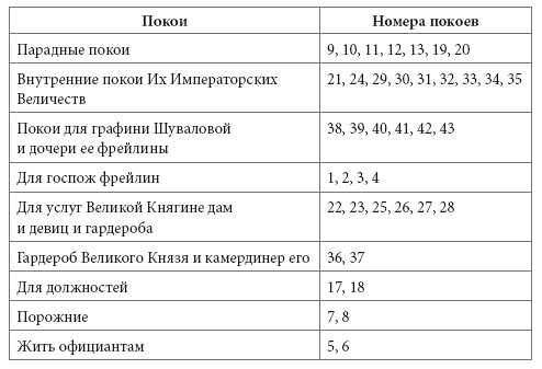 Естественно, перечень комнат неоднократно менялся и уточнялся, но в целом в июне 1796 г. заселение дворца шло по следующей схеме[15] (см. табл. 2):