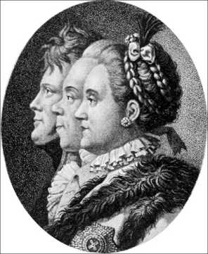 Александр I, Павел I, Екатерина II. Гравюра. Берлин. 1814 г.