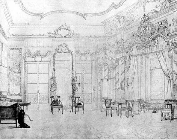 В мае 1813 г. гоффурьеру Терентьеву поступило новое распоряжение: «Сверх назначенного для проживания нынешним летом графа В.П. Кочубея правого флигеля Нового дворца. в прибавок к оному еще три комнаты в верхнем этаже того ж дворца, которые были занимаемы камердинером Крыловым. А для помещения генерал-лейтенанта Бетанкура приготовить в оном Александровском дворце называемые “егоровы” в верхнем этаже комнаты с особою для хода лестницею, также кухню для потребных служителей».[70] Практика «покомнатной сдачи» Александровского дворца продолжалась вплоть до смерти Александра I в 1825 г. Впрочем, иногда во дворце Александр I размещал и именитых гостей. Например, графиня С. де Шуазель-Гуфье, жившая в 1824 г. в Царском Селе, упоминает, что в угловых комнатах второго этажа правого флигеля Александровского дворца имелись апартаменты для гостей.[71]