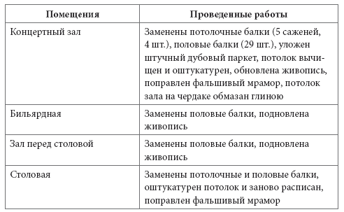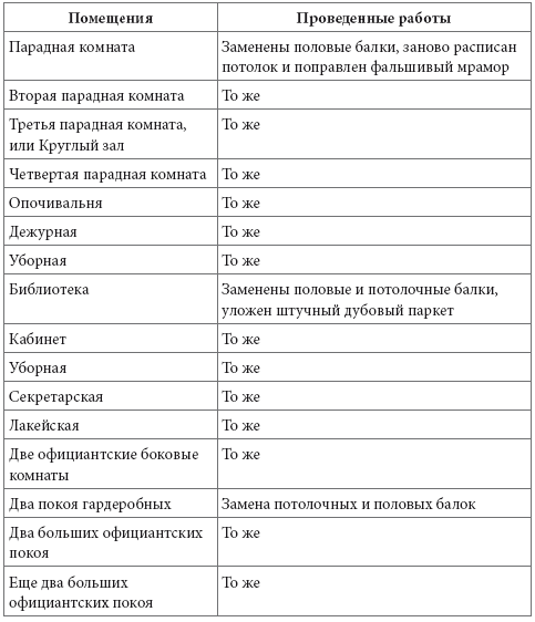 Список ремонтных работ, продолжавшихся с июня по ноябрь 1809 г., весьма внушителен. Согласно «Описи Александровскому дворцу… с означением вещей на местах, так же что сделано и исправлено вновь», летом 1809 г. в основном шла замена половых и потолочных балок, иногда в залах и комнатах менялся паркет. Как следует из указанной «Описи», половые и отчасти потолочные балки за 13 лет сгнили, и их надо было срочно менять. Сам характер ремонтных работ свидетельствовал, что к 1809 г. в Александровском дворце жить было просто опасно (наряду со сгнившими половыми и потолочными балками, вспомним падающую с потолка штукатурку и люстры) (см. табл. 3).