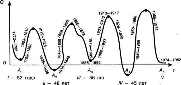 Длинные циклы Кондратьева имеют следующую структуру: каждый цикл состоит из двух стадий или полуволн: повышательной и понижательной; весь цикл принято подразделять на четыре фазы: оживление, подъем, рецессия, депрессия.