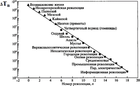 В работе А.Д. Панова[21] последовательность технологических революций человечества продолжается в прошлое, вплоть до появления жизни на Земле, как показано на рис. 1.2. Здесь ?Тn – промежуток времени от даты революции с номером n до даты сингулярности, соответствующей пределу последовательности революций.