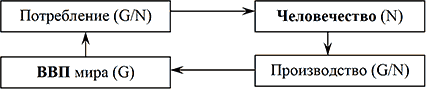 Его основными элементами являются человечество, которое характеризуется своей численностью, – N, мировой ВВП – G, а также процессы производства ВВП и его потребления, которые можно характеризовать величиной G/N.