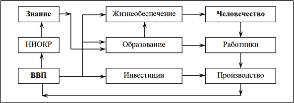 Согласно данной схеме, рост числа людей (общество) происходит в связи с ростом ВВП, причем растущее по численности человечество создает все больше знаний, которые влияют на ускорение роста производства и объема ВВП. Далее мы более детально рассмотрим компоненты данного цикла развития и их взаимосвязи.