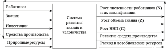 В результате функционирования этой системы на протяжении всей истории человечества происходил рост первых четырех входных ресурсов: числа и квалификации работников, объема знаний, выпуска продуктов, объем которых может быть оценен в финансовых единицах, и развития средств производства. Природные ресурсы в противоположность этому исчерпываются, и пока можно прогнозировать лишь сохранение природной среды в приемлемом состоянии. Однако в настоящее время уровень эксплуатации природы приблизился к предельному уровню, и рано или поздно, но необходимо будет перейти к режиму широкого воспроизводства ресурсов, требуемых для функционирования данной системы. Пристальное внимание нужно уделить энергетическим и водным ресурсам, а также факторам, влияющим на стабильность климата, сохранение биосферы и природной среды.
