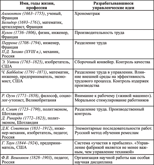 Некоторое представление об идеях, предшествовавших в исторической ретроспективе становлению современного социального управления, а также о предтечах современного менеджмента, их идеях и подходах к управлению дается в табл. 1.1.