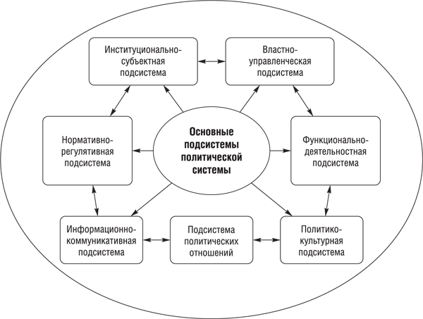 При рассмотрении политической системы в ином структурном ракурсе она предстает в совокупности несколько иных подсистем: а) институционально-субъектная; б) властно-управленческая; в) нормативно-регулятивная; г) политико-культурная; д) функционально-деятельностная; е) подсистема политических отношений; ж) информационно-коммуникативная.
