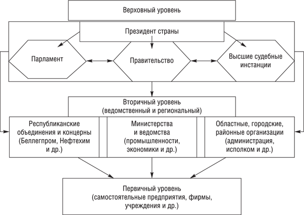 Подчеркнем еще раз: высший уровень организационно-управленческой структуры составляют органы государственного руководства страной, определяющие стратегические цели развития страны и/или отдельных сфер общества и осуществляющие функции управления всеми типами и видами организаций, всеми сторонами жизнедеятельности общества. В странах с президентской формой правления, к которым принадлежат Россия, Беларусь, другие страны СНГ, этот верховный уровень организационно-управленческой структуры подразделяется на два подуровня (звена). Верховную власть в такой структуре осуществляет Президент страны, избираемый всенародным голосованием. В его руках сосредоточены все нити руководства страной. Второй подуровень организационно-управленческой деятельности и соответствующей структуры в такой государственной системе составляют Парламент, Правительство, а также Конституционный и Верховный суд. Такая модель организационно-управленческой структуры общества, реализуемая в Республике Беларусь, графически представлена на рис. 3.