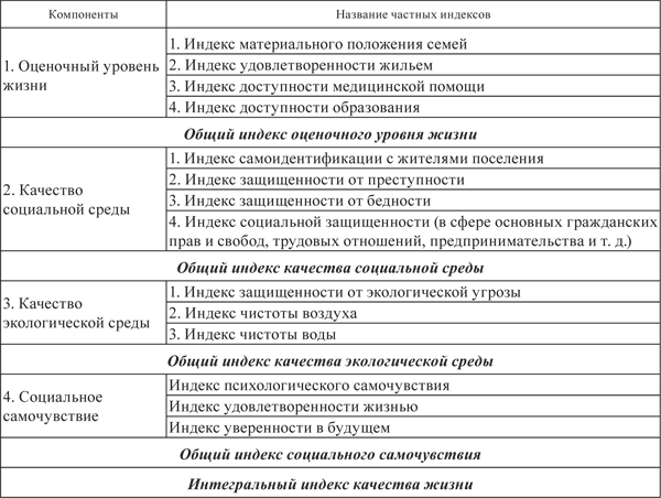 Интегральный индекс качества жизни. В социологических методиках нет единого мнения о том, какой вес имеют частные и общие индексы по каждому компоненту при расчете интегрального индекса качества жизни. Ряд исследователей полагают, что индекс оценочного уровня жизни имеет больший вес, чем, например, качество социальной среды, другие признают все индексы одинаково значимыми и интегральный индекс рассчитывают как их среднее арифметическое, полагая, что при этом наблюдается компенсирующий эффект одних компонентов качества жизни другими.