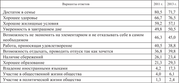Для белорусских граждан понятие «высокое качество жизни» означает, прежде всего, достаток в семье (80,5 %), хорошее здоровье (66,7 %), хорошие жилищные условия (59,2 %), уверенность в завтрашнем дне (49,8 %) и возможность не экономить на элементарном и не отказывать себе в самом необходимом (46,3 %) (табл. 8).