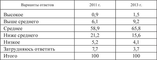 Анализ динамики оценок показывает, что в 2013 г., по сравнению с 2011 г… на первое место вышло состояние здоровья, ценность которого повысилась на 10 процентных пунктов; достаток в семье, актуальность которого снизилась на 9 пунктов, переместился на второе место. В 4 раза повысилась ценность владения иностранными языками, в 1,5 раза – ценность участия в общественной жизни, в 2 раза – участия в политической жизни общества, хотя сами по себе данные показатели занимают 11-е и 12-е места рейтинга ценностей, присущих качеству жизни. По данным исследования, в 2013 г. белорусское население более высоко оценило качество своей жизни в целом, чем в 2011 г., при этом структура оценок не претерпела значимых изменений, доля респондентов, «высоко» и «выше среднего» оценивающих свою жизнь, увеличилась за данный период на 3,7 %, доля респондентов, дававших «средние» оценки, осталась доминирующей (+ 6,9 %), снизилась на 6,7 % доля населения, оценивающая качество своей жизни как «ниже среднего» и «низкое» (табл. 9). Интегральный показатель качества жизни белорусского населения на начало 2011 г. составлял 42,0 пункта, в кризисный период снизился, однако к 2014 г. спад был преодолен и значение индекса достигло 43,0 пункта.