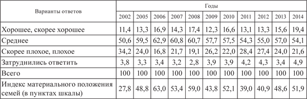 Оценочный уровень жизни. Индекс материального положения семей. В Беларуси в период с 2002 по 2006 г. происходило улучшение материального положения белорусских семей за счет снижения численности малообеспеченных семей, отрицательно оценивающих свой достаток, и это выразилось в росте индекса материального уровня жизни за данный период с 27,8 до 63,0 пункта. В ходе финансово-экономического кризиса 2009 г. произошло снижение индекса до 43,8 пункта за счет увеличения численности негативных оценок материального положения. По мере некоторой стабилизации ситуации в 2010 г. (поднятие зарплат, стабилизация обменного курса рубля и т. д. перед выборами) значение индекса материального уровня жизни увеличилось и на начало 2011 г. составляло 55,4 пункта. Надо отметить, что на начало 2011 г. население еще не ощущало кризиса, что деноминация, резкий рост цен на потребительские товары и обесценивание белорусского рубля начали происходить к концу весны 2011 г., после проведения весеннего мониторинга, а вот осенний мониторинг 2011 г. уже «снимал» настроение общества после всех потрясений, после прохождения пика роста общественной напряженности летом, и это выразилось в снижении индекса в течение 2011 г. с 55,4 до 39,0 пункта. По итогам принятых мер и стабилизации социально-экономической ситуации в 2014 г. значение индекса материального уровня жизни возросло до 51,9 пункта (табл. 10).