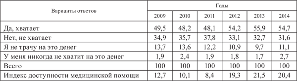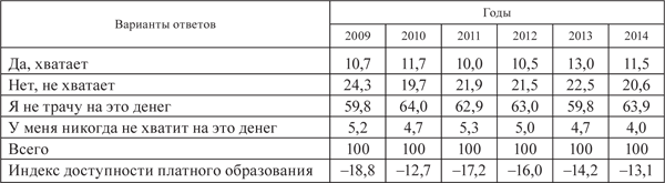 В связи с кризисными явлениями 2011 г. произошло снижение доступности образовательных услуг, что выявилось в снижении значений индекса (-17,2), к 2014 г. ситуация улучшилась, хотя на сегодняшний день группа населения, которой не хватает денежных средств на платное образование (профессиональное обучение) для себя, своих детей, в 2 раза превышает долю населения, у которой хватает на это средств (табл. 13).